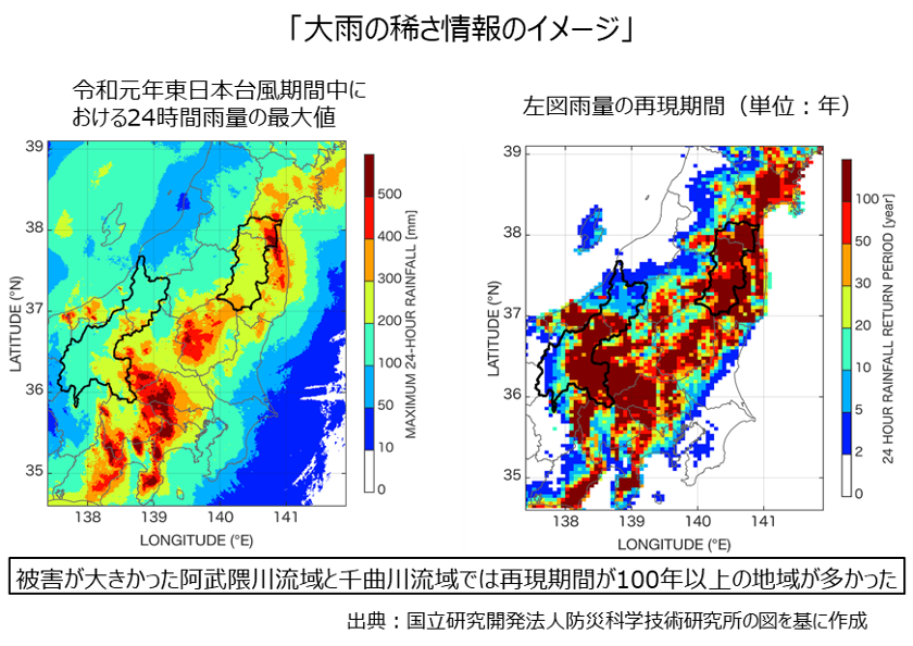 大雨の稀さとは、再現期間という表現を使って観測された降水量が平均して何年に一度くらいの確率で起こるかを表すものです。