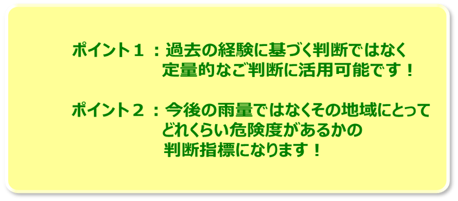 したがって、災害が起こる恐れ(危険度)の度合いは、雨量そのものよりもその地域にとってどれくらい稀な大雨であるかの方がより重要な情報になると考えられます。