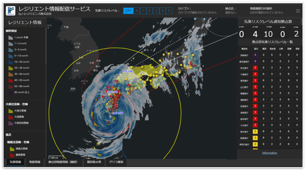 自社の拠点やサプライチェーンの物流拠点、社員の皆様のご自宅などお知りになりたい地点を予め登録可能です。設定したリスクレベルを超えると自動的にアラートでお知らせし、ご対応判断にお役立ていただけます。