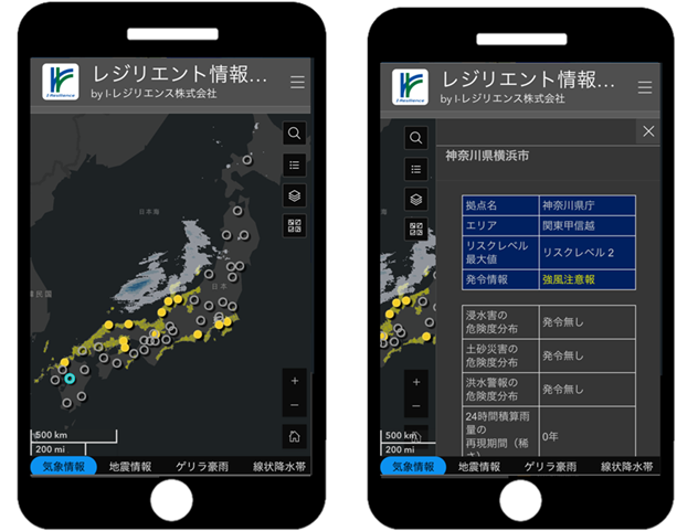 PC版に加えて、モバイル版の簡易バージョンで緊急時に迅速に情報を確認でき、各拠点ごとの現在の気象情報を地図やポップアップで直感的にご確認いただけます。
